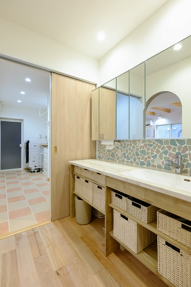 カウンターを広く取り大きな鏡を設けた、並んで身支度できる洗面化粧台。鏡下のモザイクタイルもお気に入り。