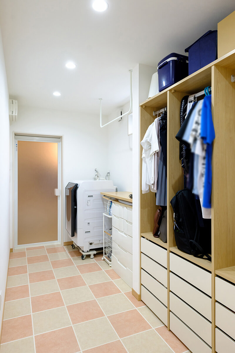 洗濯がその場で完結できるよう考え抜かれた広めの洗濯・脱衣室。室内干しができ、すぐに収納でき、アイロンがけも可能な家事ラク空間。