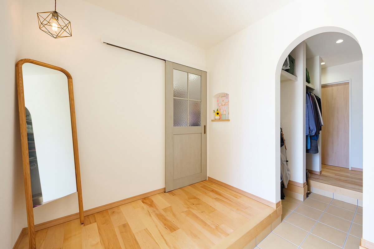 お客様を迎える玄関は複数人が立てるように広めの上がり框に。アーチ型の下がり壁が印象的なシューズクロークからは洗面台へのスムーズな動線も確保。