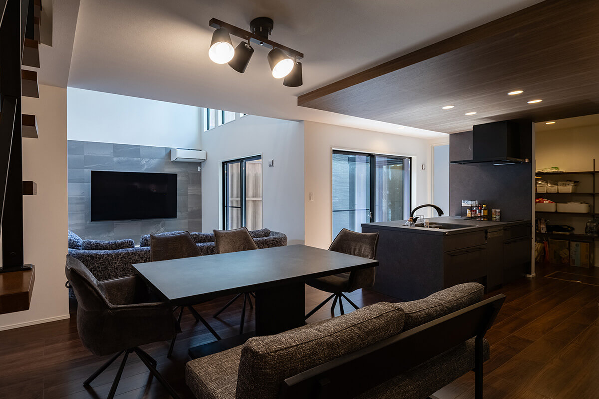 中庭と吹抜けを設け、天井の高い伸びやかなリビングを実現