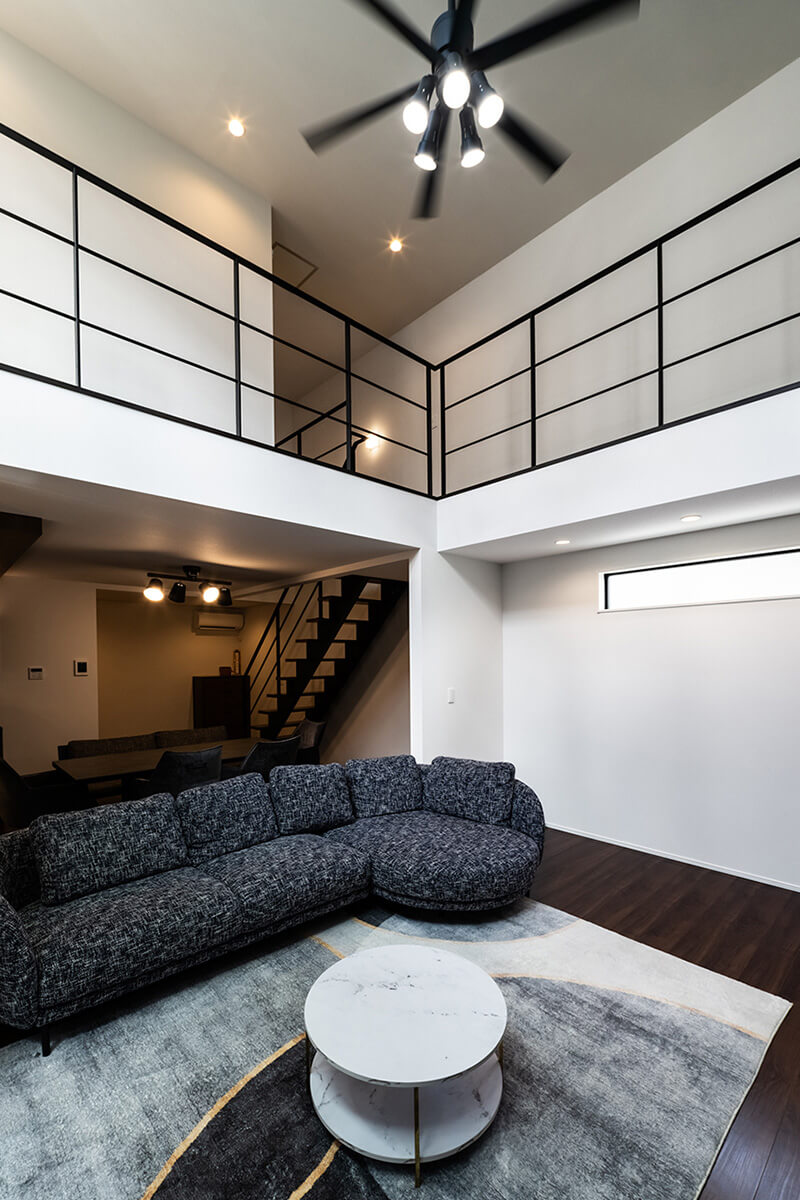 リビングはキッチンやダイニングを含めLDK全体で30畳超の大空間。吹抜け部分は約5m20cmの高さがあり、照明付きのシーリングファンとスチール手すりがアクセントに。