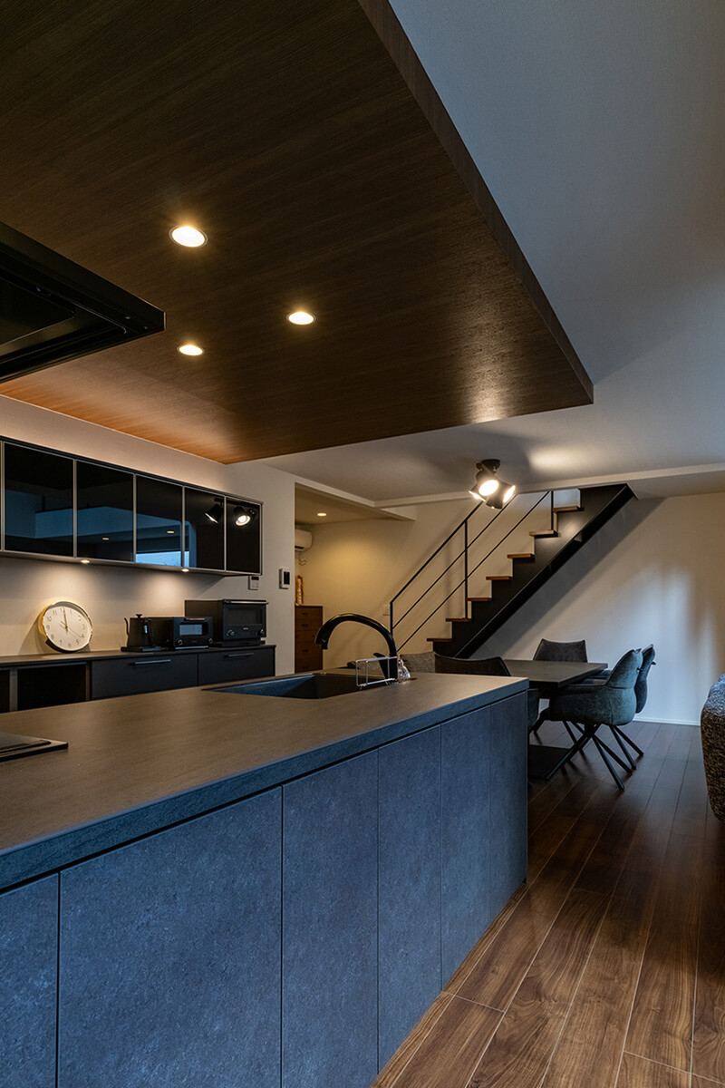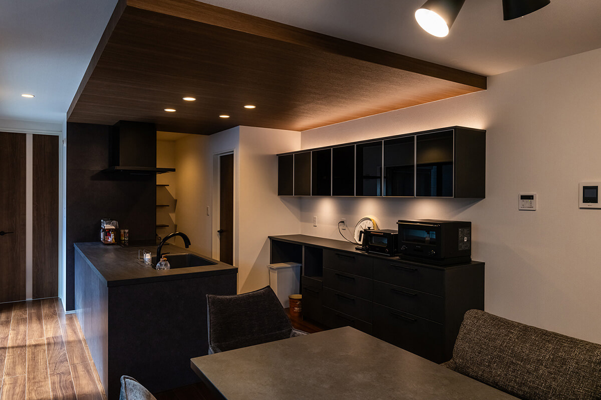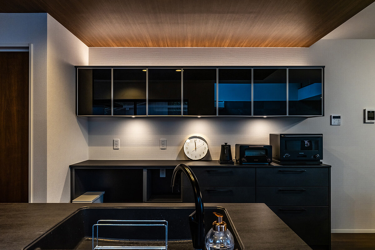 ショールームで気に入って採用を決めたシステムキッチン。調和を考慮してシンクや水栓金具も黒を採用し、料理のしやすい広めのワークトップが特徴的。