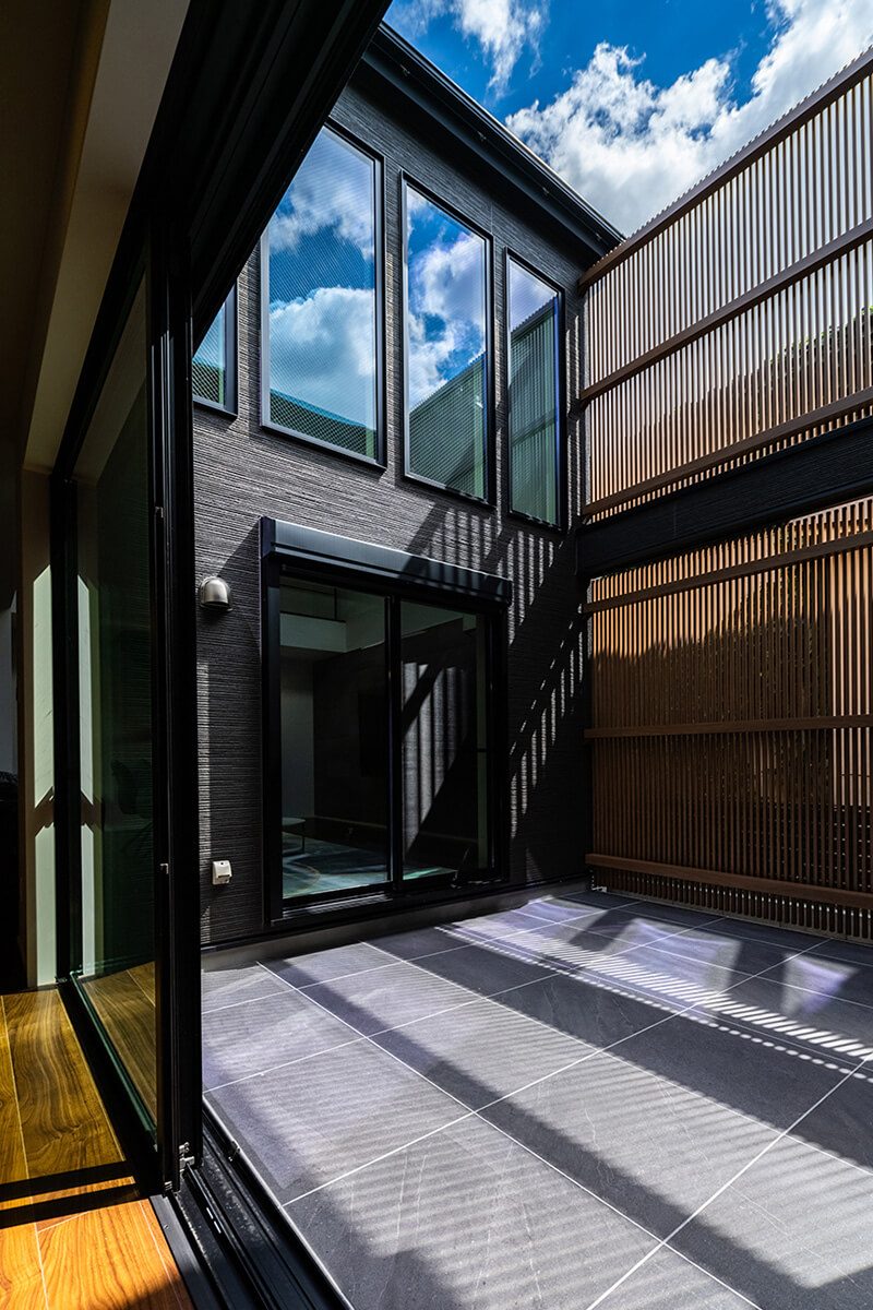 陽光をふんだんに取り入れつつ、縦格子の目隠しで視線に配慮した8畳ほどの中庭。バーベキューテラスなどアウトリビングとして利用しやすい1階の中央に配置。