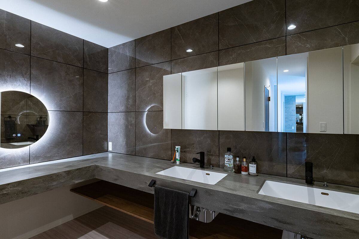ホテルの洗面化粧台をイメージしてつくったというこだわりの人造大理石カウンターの洗面室。背面に照明を仕込んだ丸い鏡が空間のワンポイント。