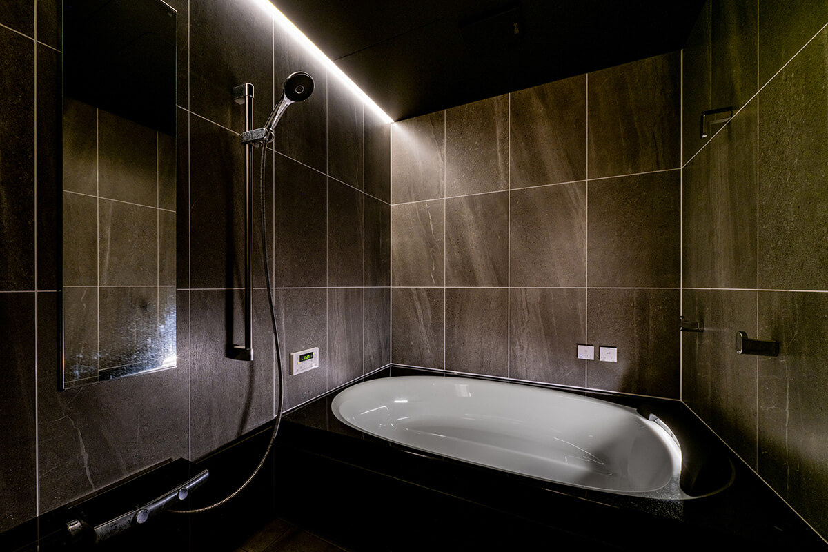 黒基調で高級感あふれる浴室は、肩湯や腰湯で疲れを癒すことができるくつろぎの空間。調光・調色可能な細いライン照明でより幻想的な空間に。