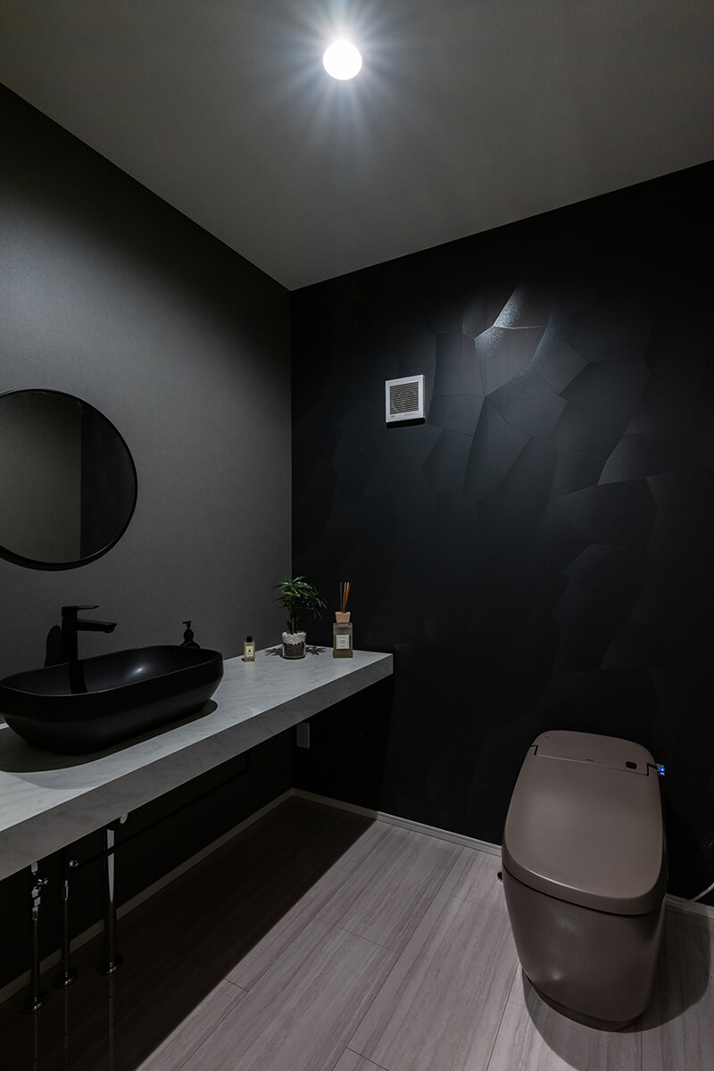 来客も利用する1階のトイレは黒で統一したシックな作りに。広々した設計の中に照明がつくり出す壁の陰影が映える。