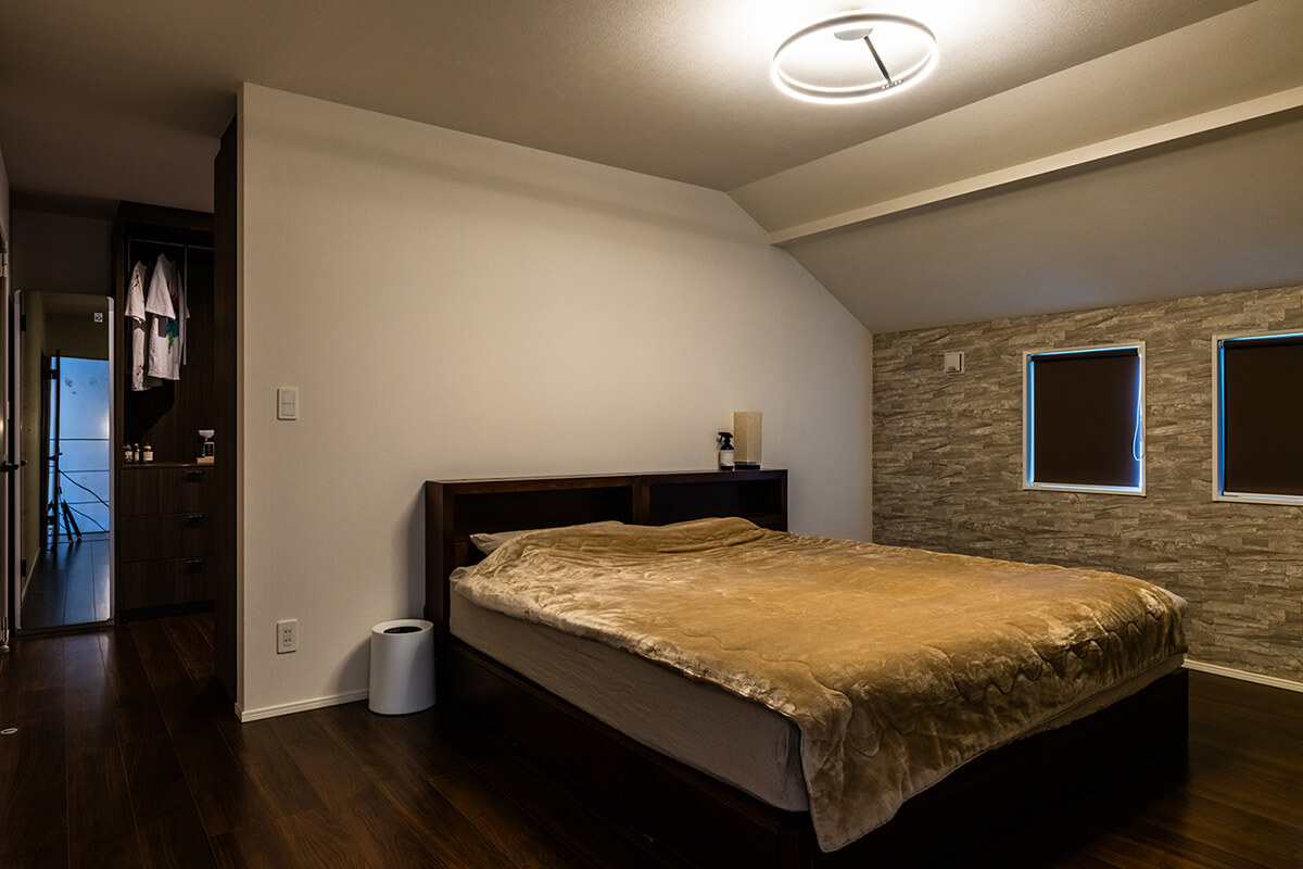 厳しい法規制で勾配天井となった空間を正方形の2つの窓と、アクセントクロスでおしゃれに仕上げた主寝室。