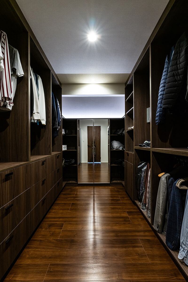 整然としたクローゼット。上部棚はレバーを引くとハンガーが下りてくる仕組み。引き出しも豊富に設け、余すことなく利用した大型のウオークインクローゼット。