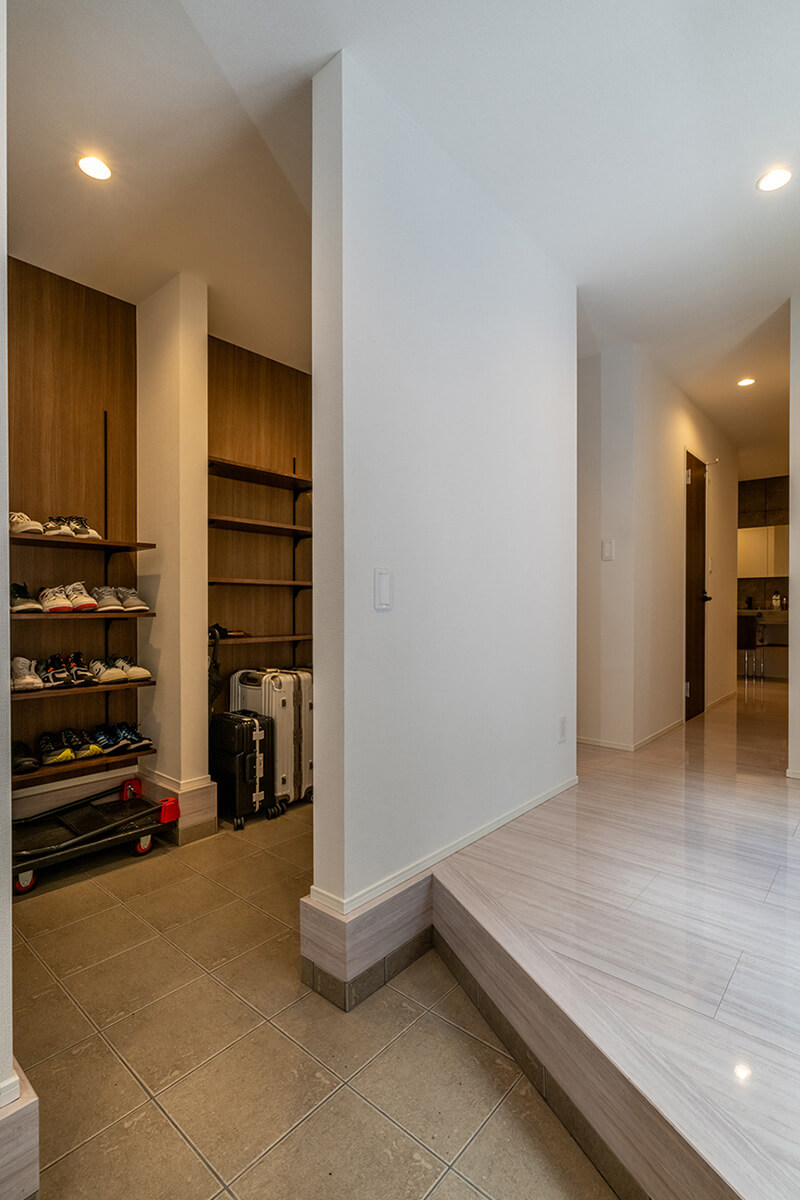玄関の上がり框を斜めにカットして、出入りしやすいシューズクローク。棚は可動式で靴のほかスーツケースなど大きなモノも収納可能。