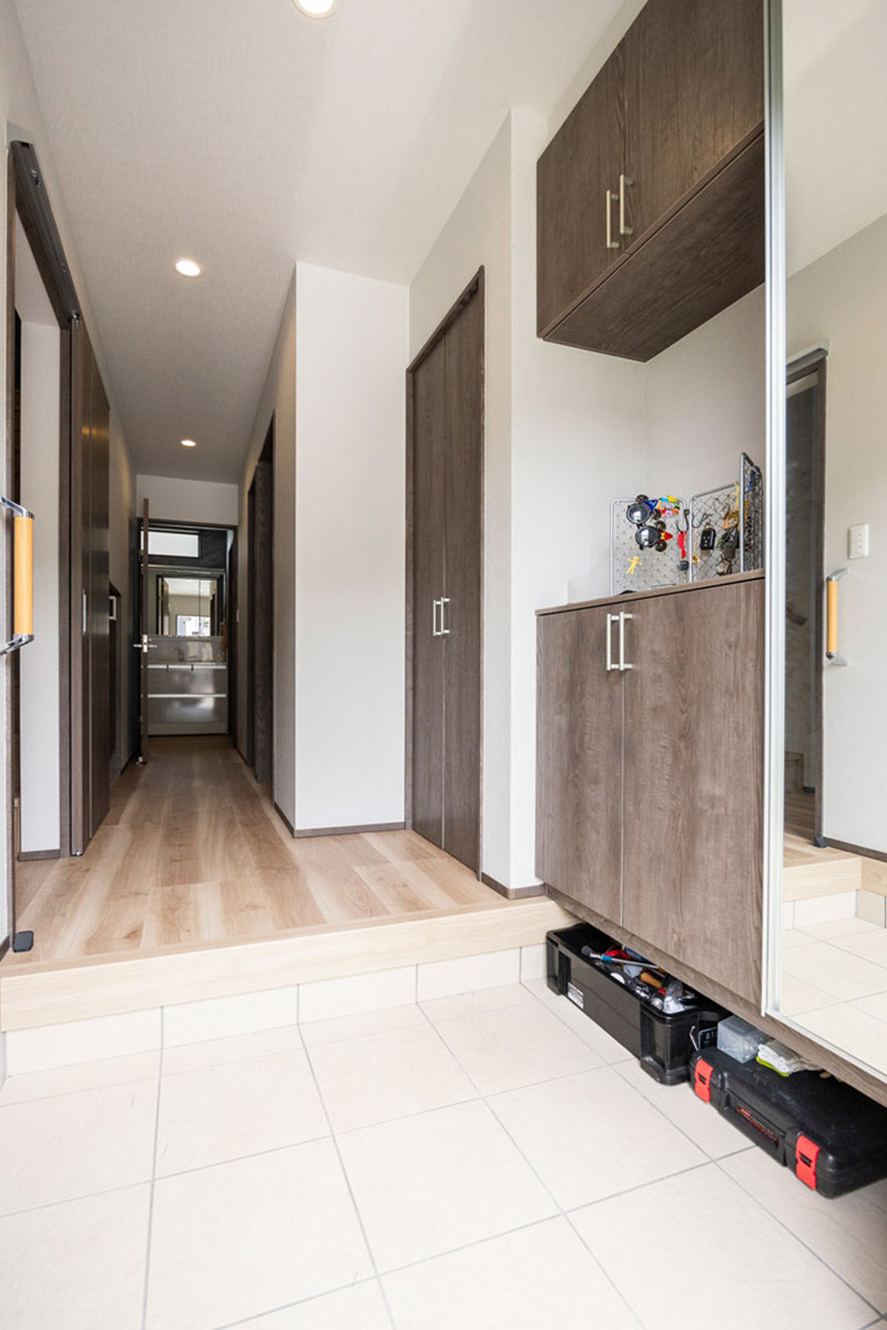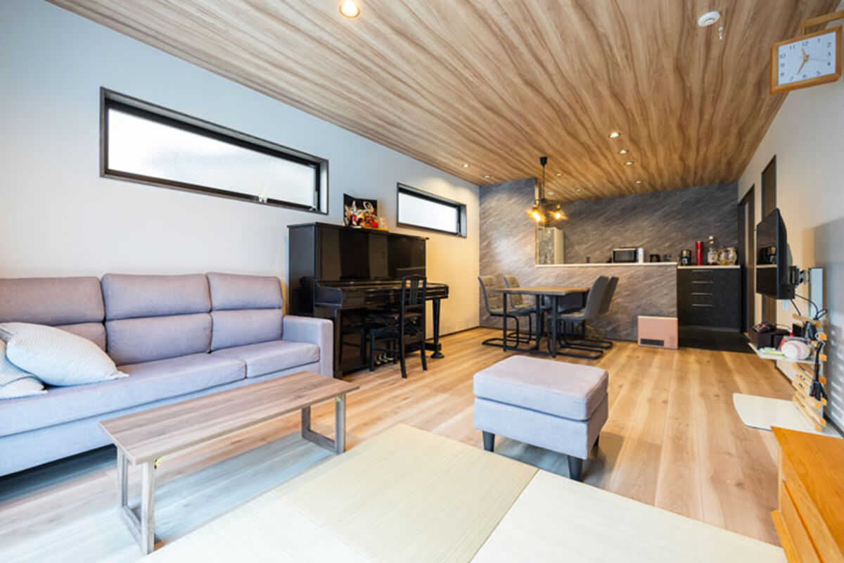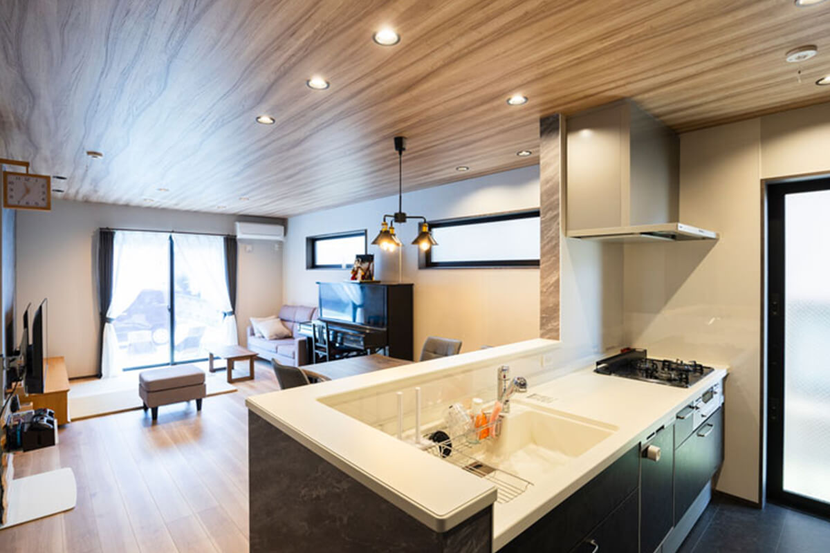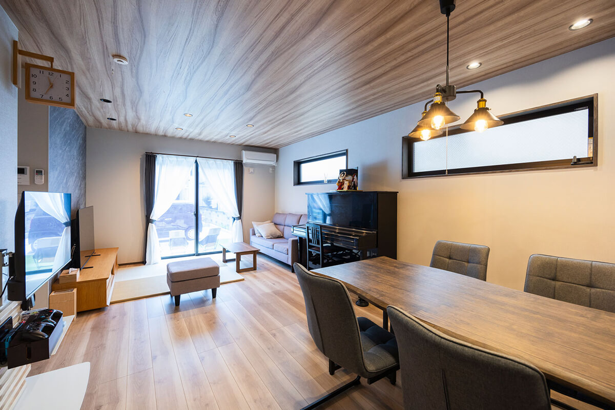 ご友人などの来客が多いこともあり、「広いリビング」は一番のご希望でした。床材と天井の色合いを木目調に合わせることで、統一感のある和風モダンに。