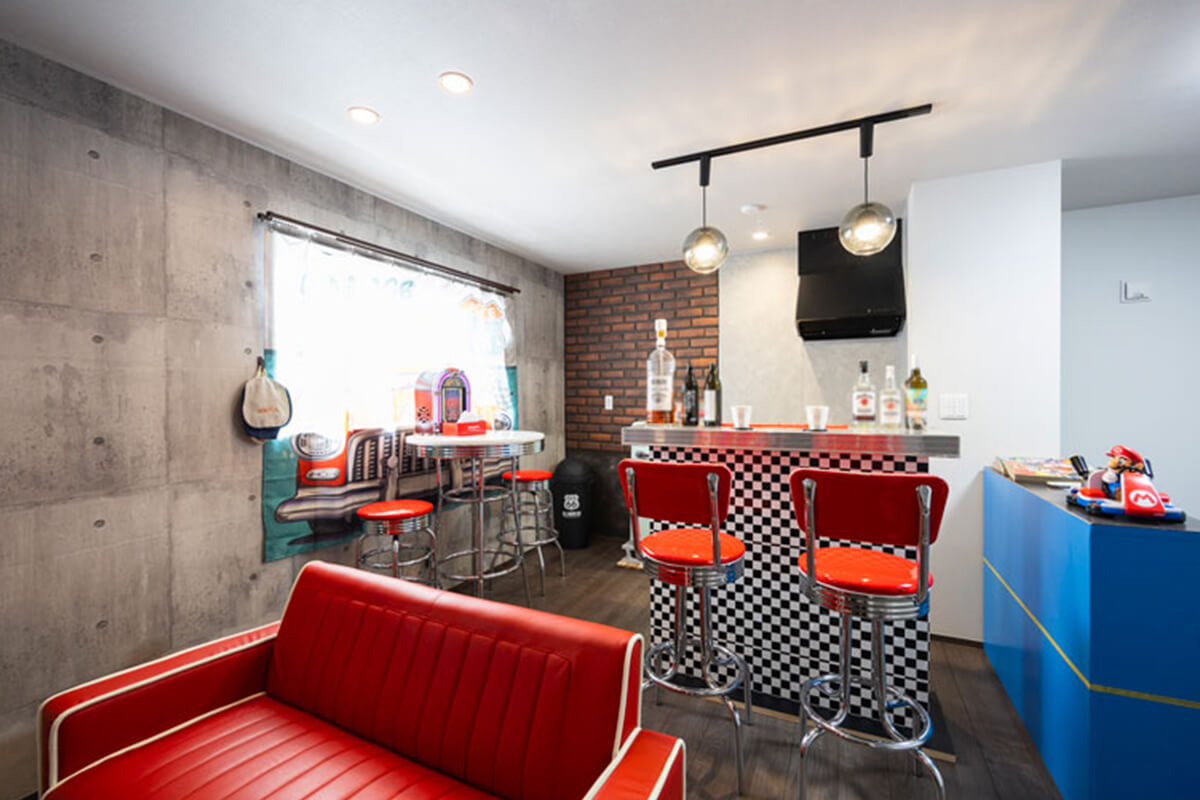 1階とはまったく異なり、アメリカンな雰囲気の2階。カウンターやレンガ調のクロスなどはご主人のDIYです。