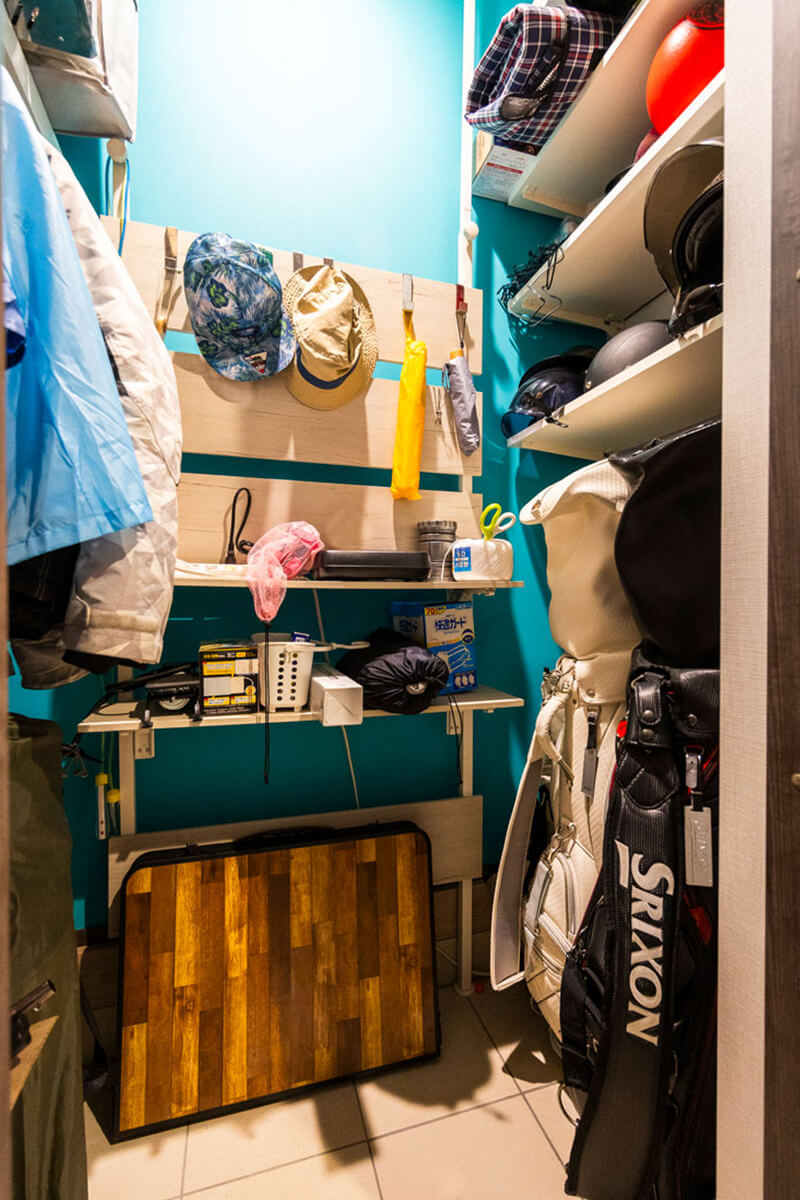 玄関横の納戸には、ゴルフバッグやBBQセットなどを収納。