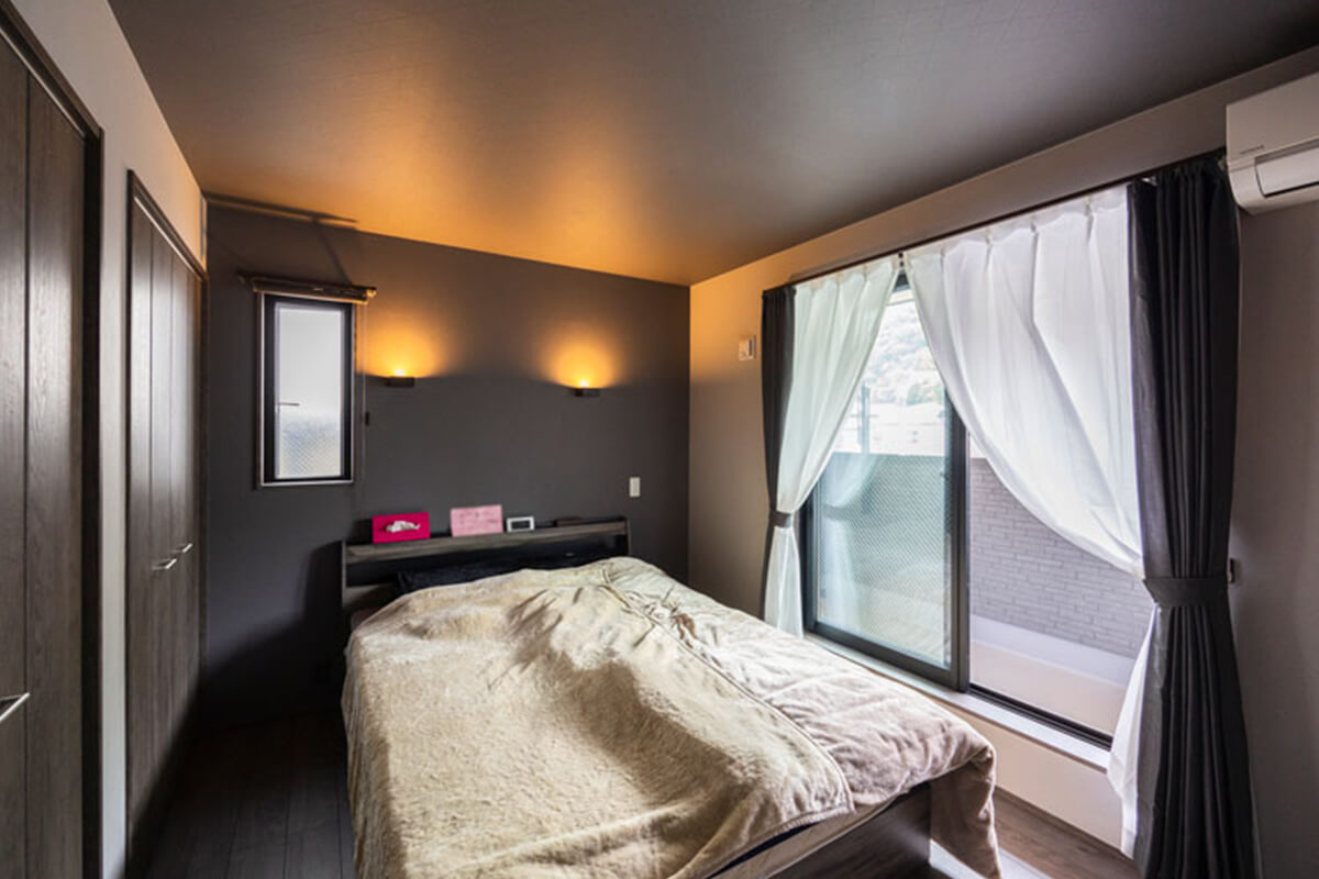 主寝室はブラケットライトのみ。二つのクローゼットは、夫婦で仲良く一つずつ利用。