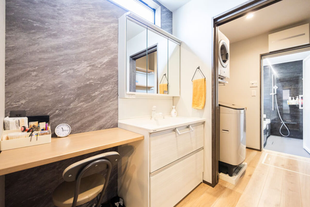 「洗濯物がよく乾く」と評判のガス乾燥機の設置を考えて設計された脱衣室。カウンターを設けて家事の効率もUP。