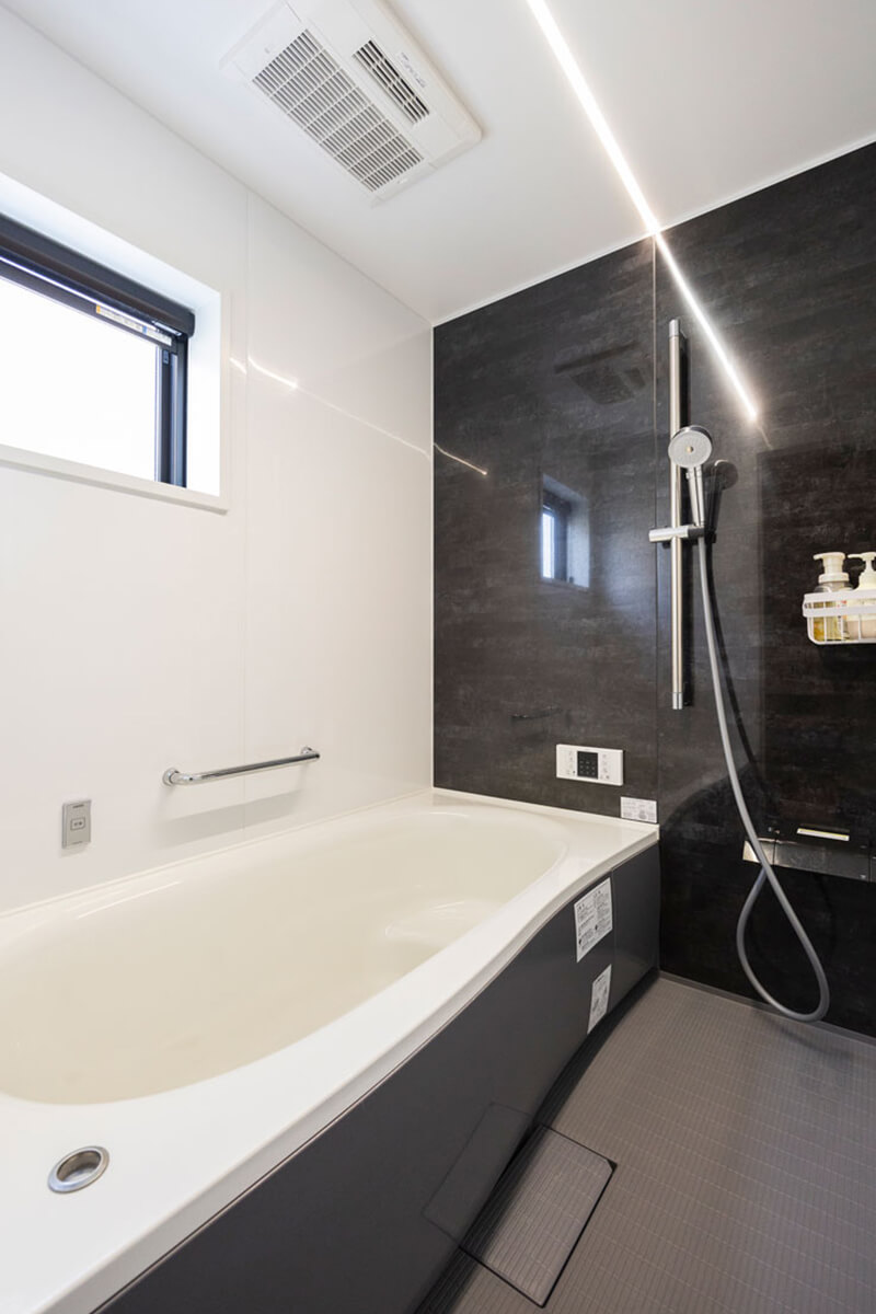 掃除の軽減も考慮して最小限の設備にした浴室。カゴもマグネット式で容易に掃除可能。