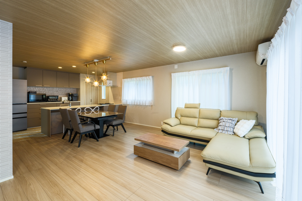 家族が自然と集まるLDKは、ゆとりの21.7帖。吊り戸棚のないオープンキッチンは、空間全体を見渡せる設計です。