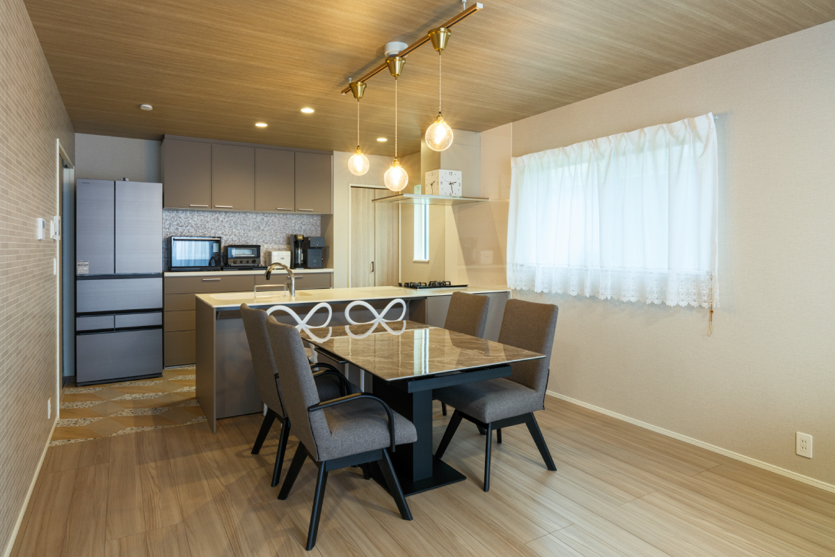 対面式キッチンを採用し、料理をしながらダイニングの家族と楽しく会話ができる設計に。テーブル上には、おしゃれなペンダント照明がアクセントとして映えています。