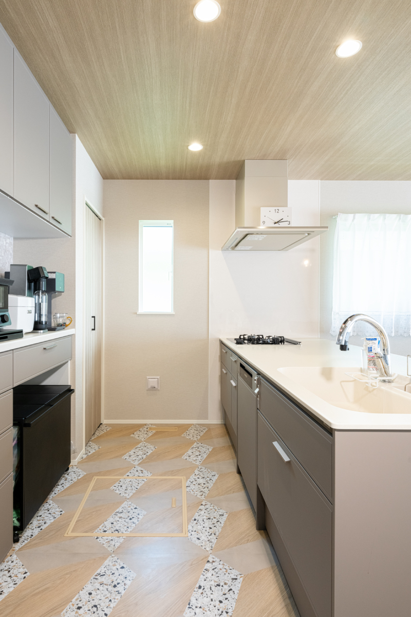 システムキッチンはショールームで一目惚れしたお気に入りを採用。フロアタイルとキッチン扉のカラーコーディネートにもこだわり、空間全体に統一感を持たせました。