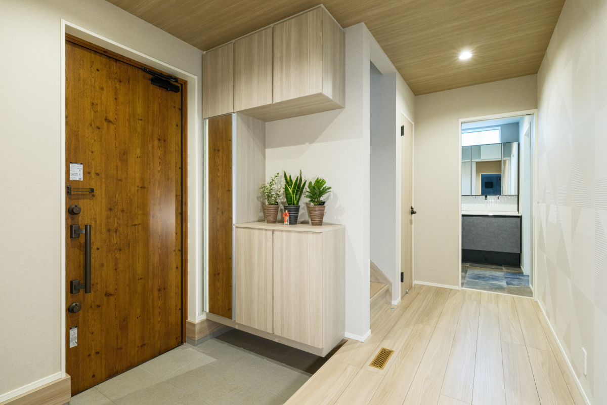 広く開放感のある玄関は、シンプルでモダンなアクセントクロスが印象的で、おしゃれな空間に仕上がっています。