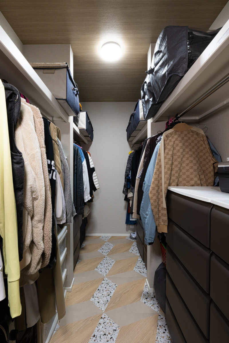 広さ3帖のファミリークローゼット。家族全員のオールシーズンの衣類をまとめて管理できるのでとても便利。