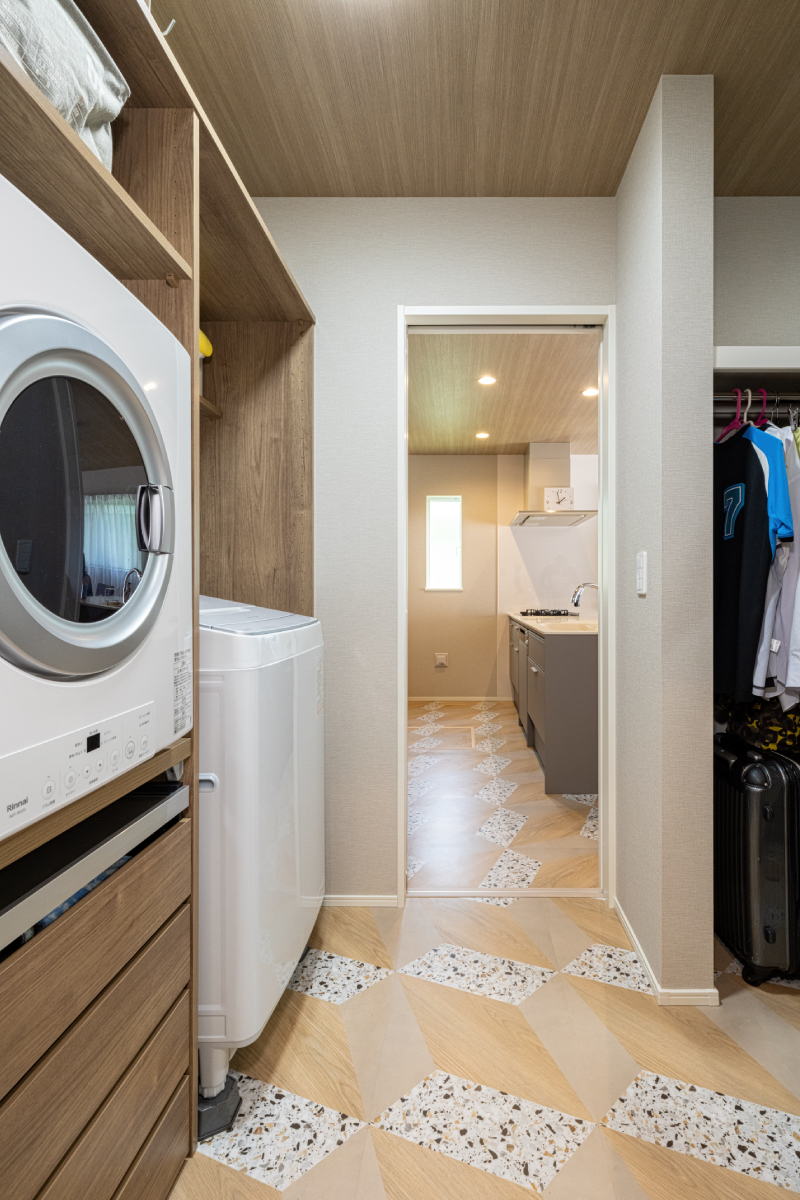 ランドリールームは、ファミリークローゼットだけでなく、浴室やキッチンとも近接しており、便利な回遊動線でつながっています。