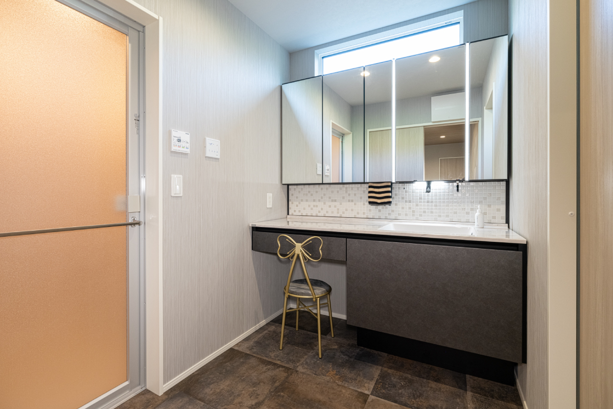 洗面化粧台もショールームで見て選んだもの。カウンターが広く、鏡も大きいので、朝の慌ただしい時間帯でも、家族が並んで身支度できます。