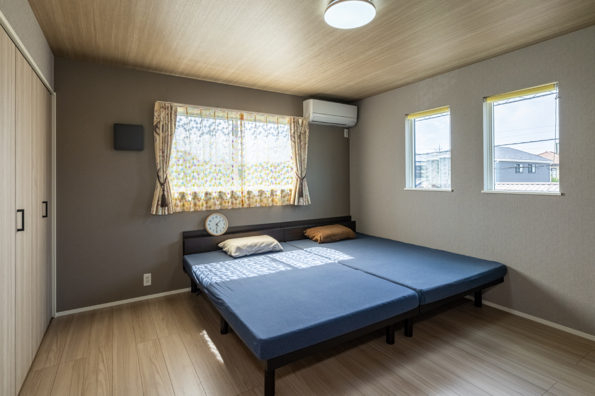 落ち着いた色合いのアクセントクロスでまとめた主寝室には、カラフルなカーテンを取り入れて彩りを加えました。