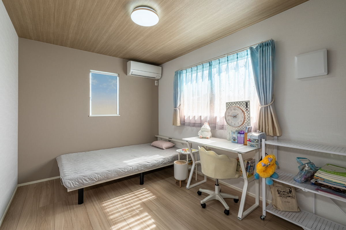 新居では、子どもたちそれぞれに個室を用意しました。インテリアや家具は落ち着いた色合いでまとめつつ、アクセントカラーとして明るいパステル調のカーテンを取り入れ、柔らかでおしゃれな雰囲気をプラスしています。