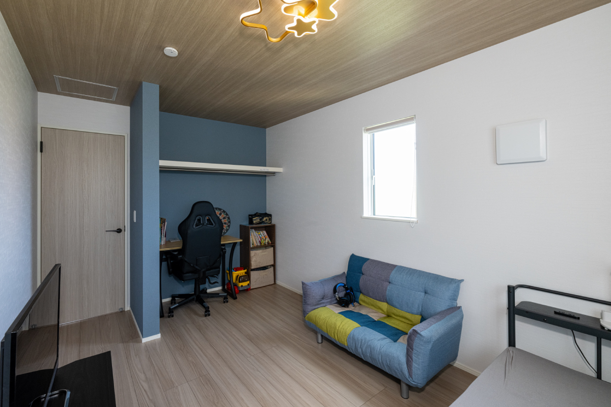 ゲーム好きなお子さまが思いきり楽しめるように、テレビとソファを配置。また、星型のシーリングライトが部屋のアクセントとなり、遊び心あふれるおしゃれな空間を演出しています。