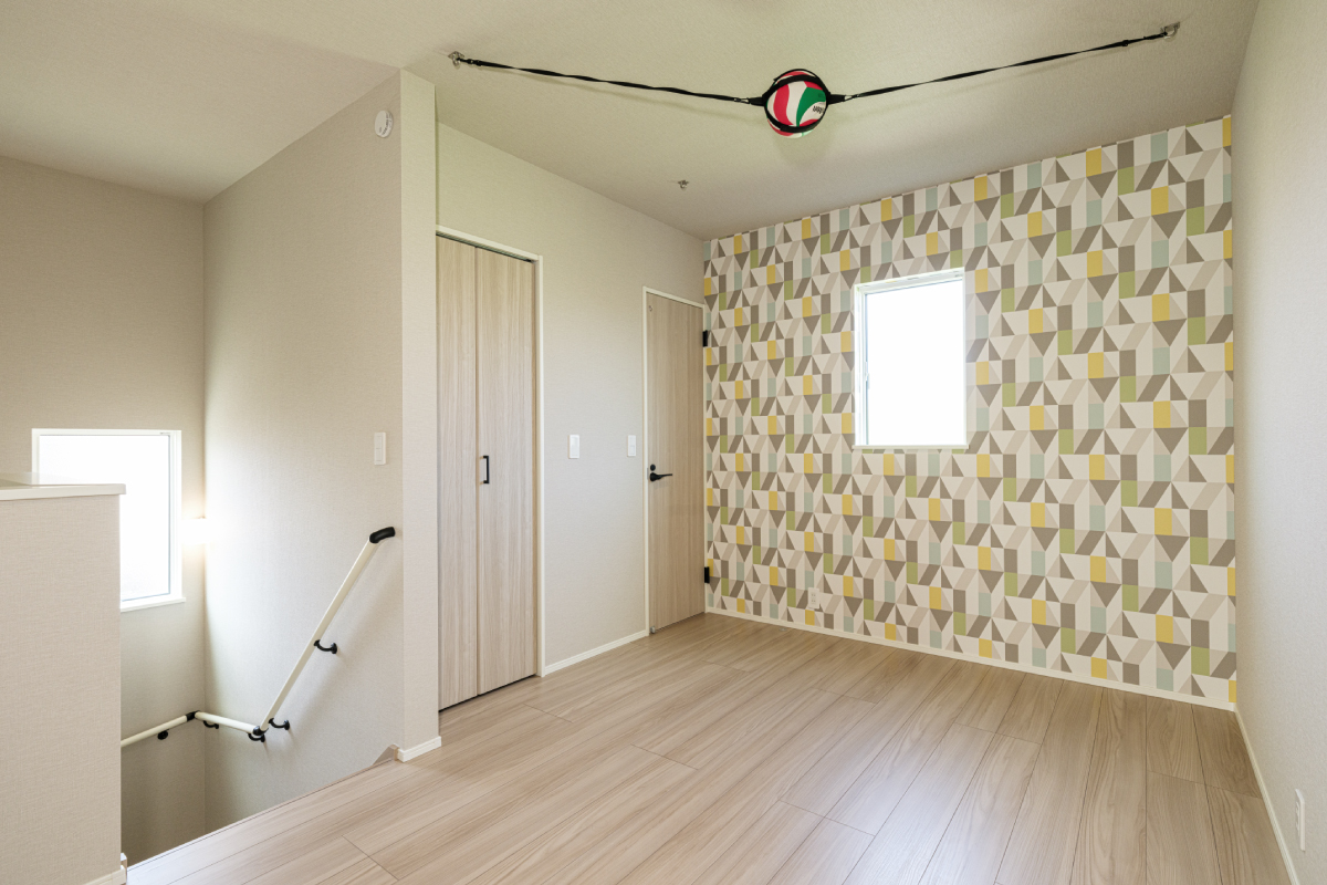 階段を上がった先のフリースペースは、お子さまがバレーボールの練習をする場所として活用しています。2階の踊り場の空間を有効に使い、家族のライフスタイルに合わせた便利で実用的なスペースになっています。