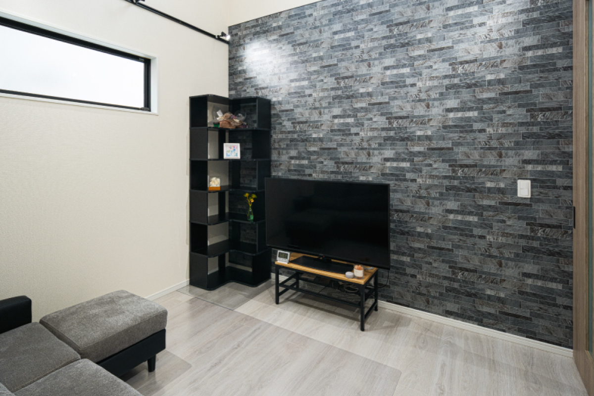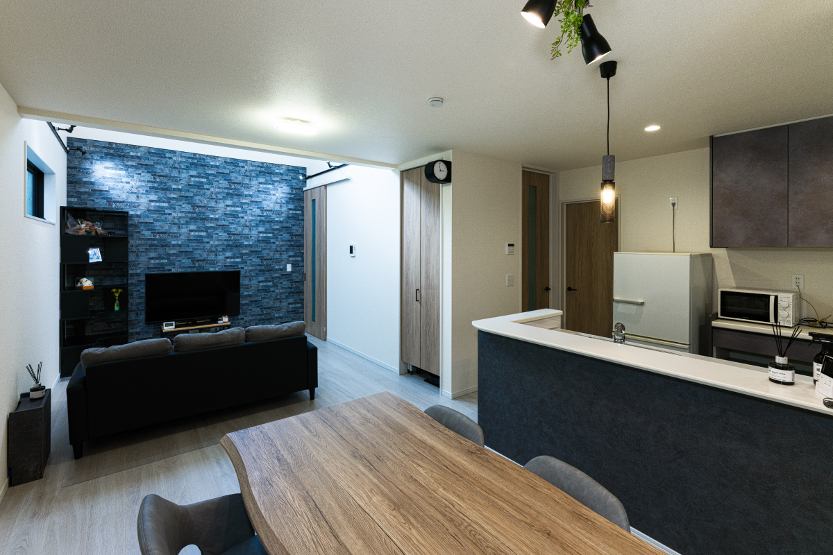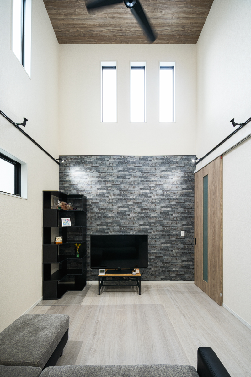 2階まで吹抜けが広がるリビングには、アクセントクロスを用いて空間に個性と魅力を添えました。さらに、廊下へ通じる扉にはハイドアタイプの引き戸を採用し、スタイリッシュな印象をプラスしています。