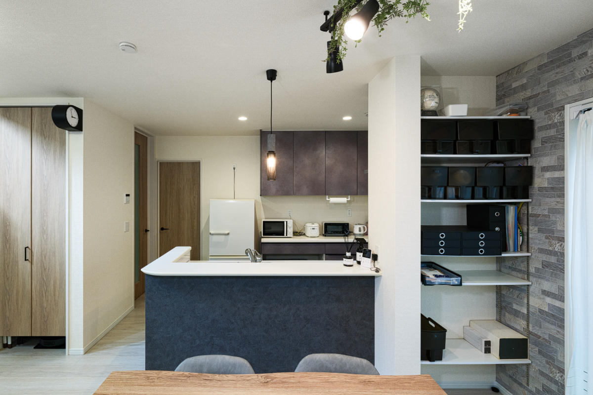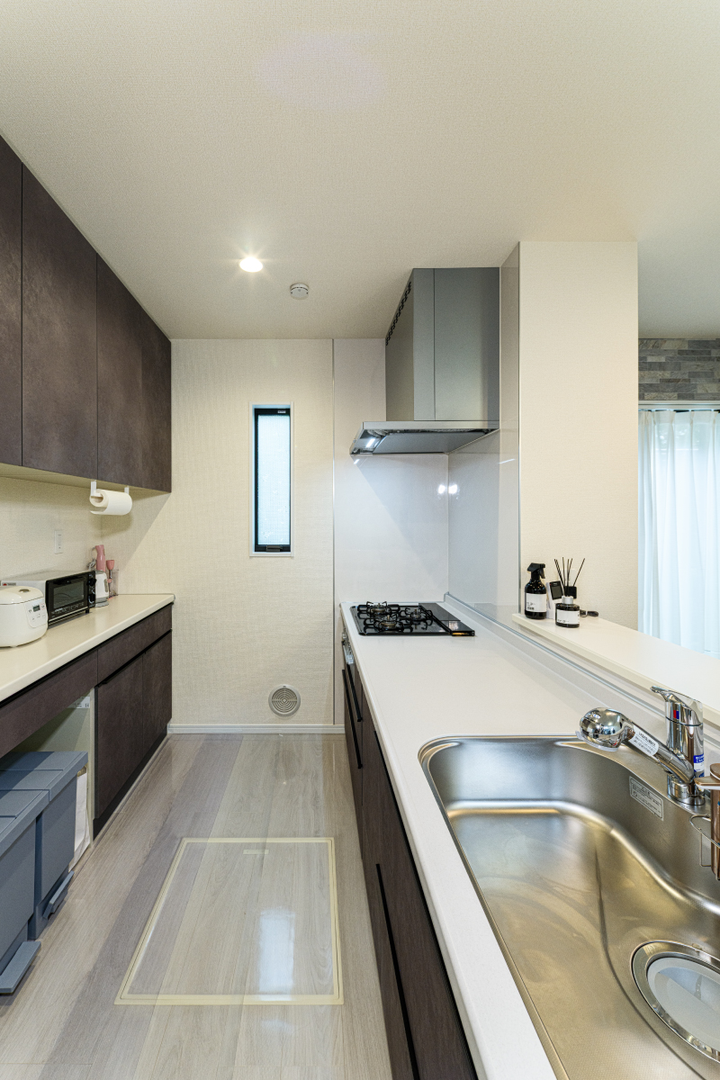 広々としたワークトップを備え、快適で作業がしやすいキッチン。背面の収納カウンターには複数のコンセントを設置し、家電を効率よく配置できる設計になっています。