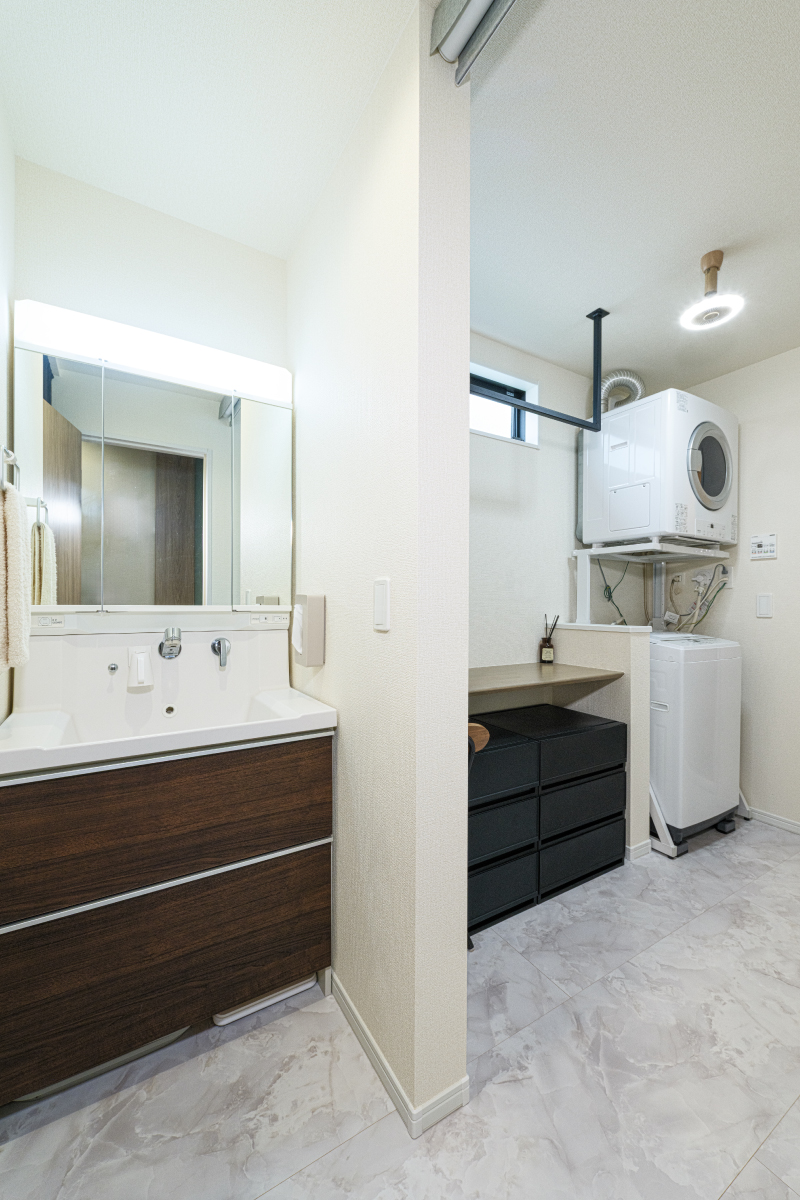 洗面室と脱衣室は分離して設計。脱衣室はランドリールームとしての機能も備えており、洗濯機や乾燥機を効率的に配置しています。また、カウンターは洗濯物をたたむ際に便利な設計です。