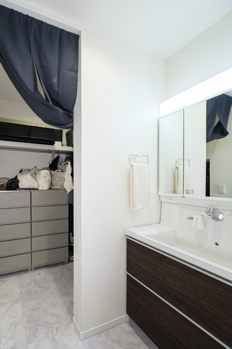 洗面室の奥にウォークインクローゼットを配置しました。ランドリールームから近いため、洗濯した衣類を収納するまでの動線が短く、効率的です。