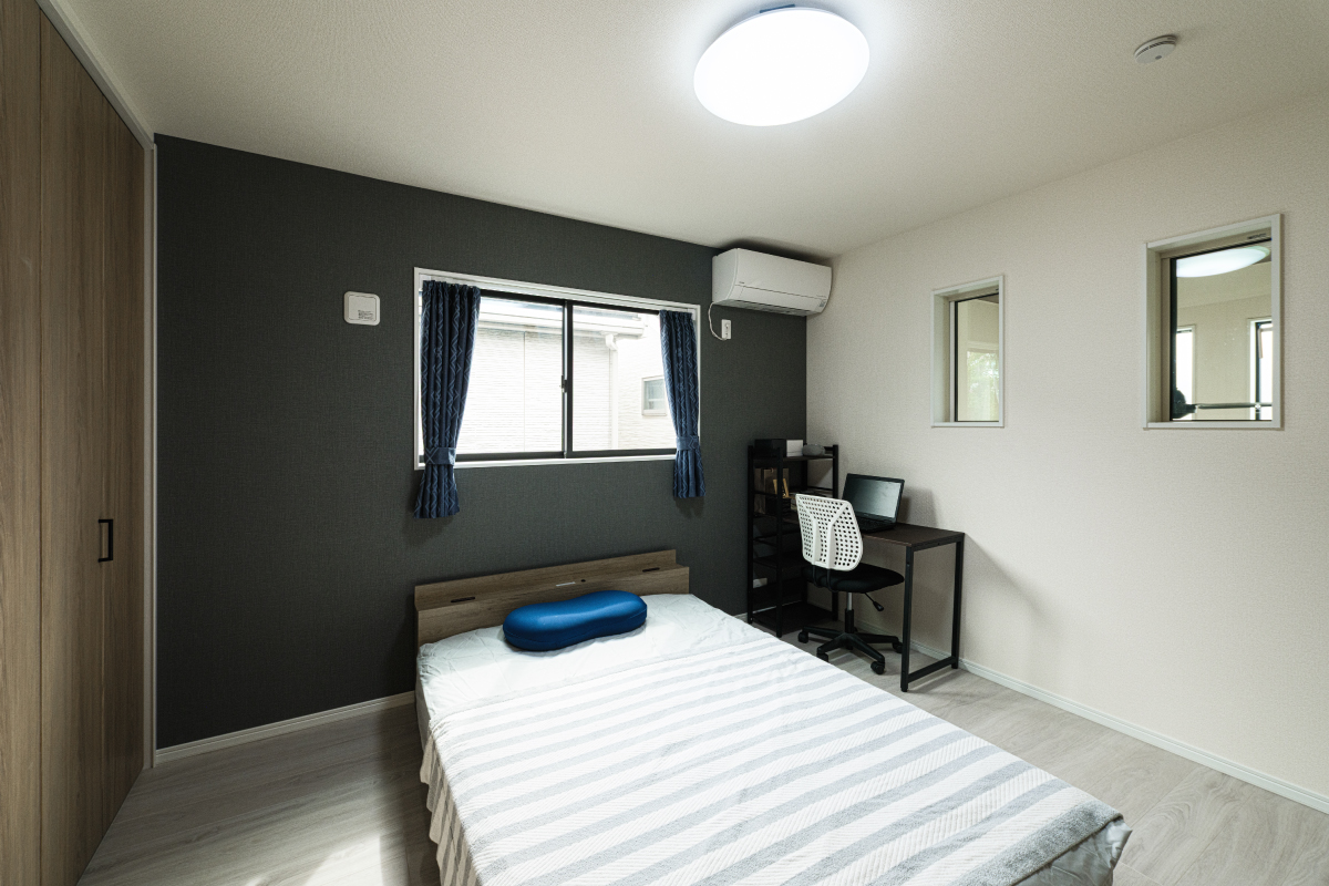 収納が充実した主寝室には、落ち着きを感じさせる色合いのアクセントクロスを採用し、空間にメリハリを加えました。また、吹き抜けに面した室内窓があるため、1階の様子をさりげなく確認することができます。