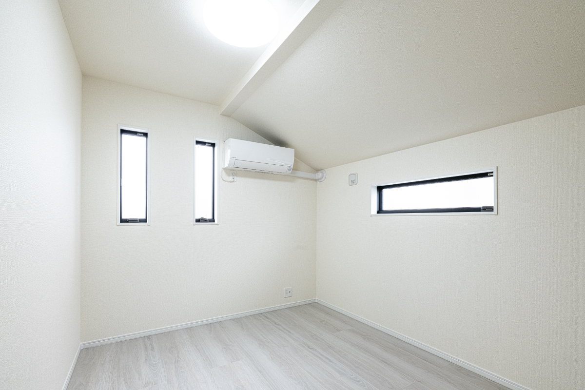 将来を見据え、2階に子ども部屋を設置。勾配天井が空間に広がりと遊び心を与えるデザインです。