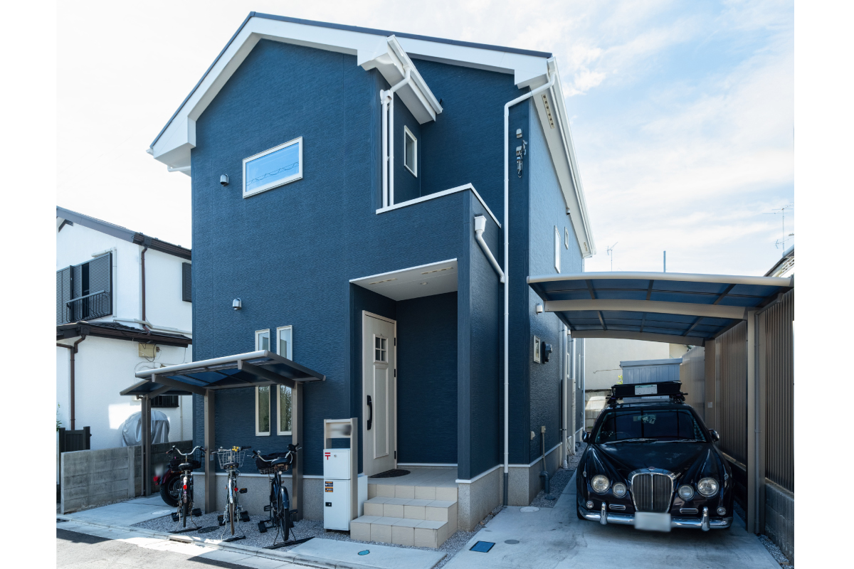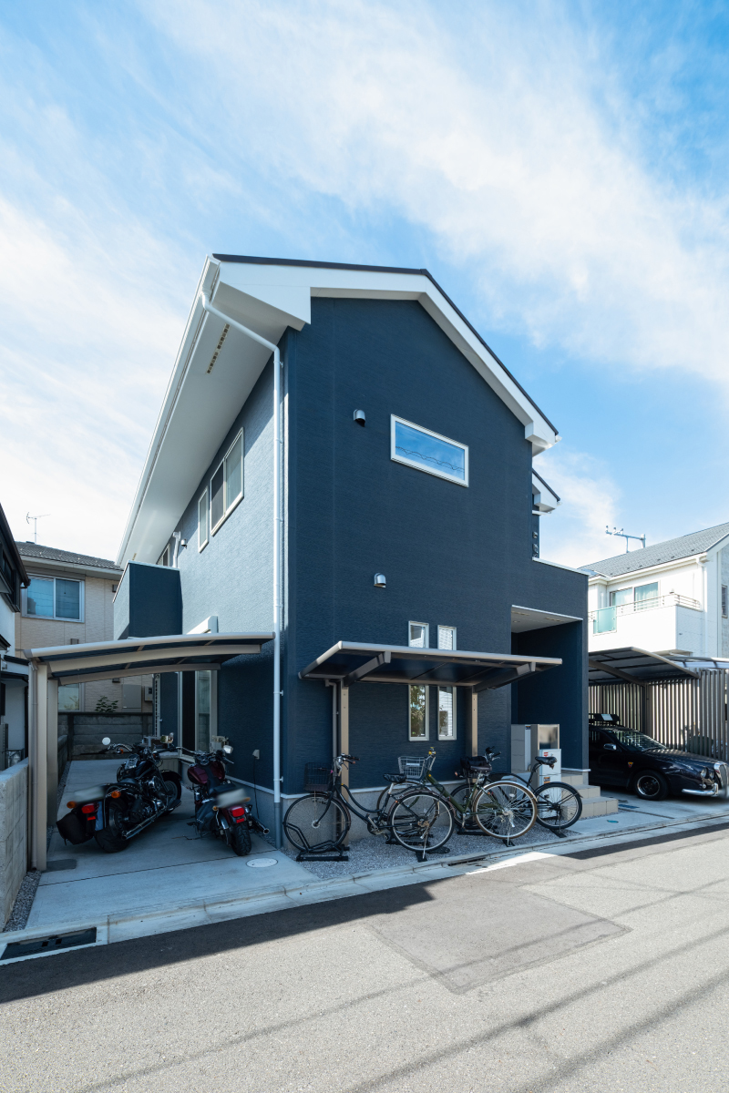サッシや雨樋、破風は白でまとめ、さわやかな印象の外観。車やバイク、自転車を止められるように建物を配置し、屋根には太陽光発電システムを搭載しました。