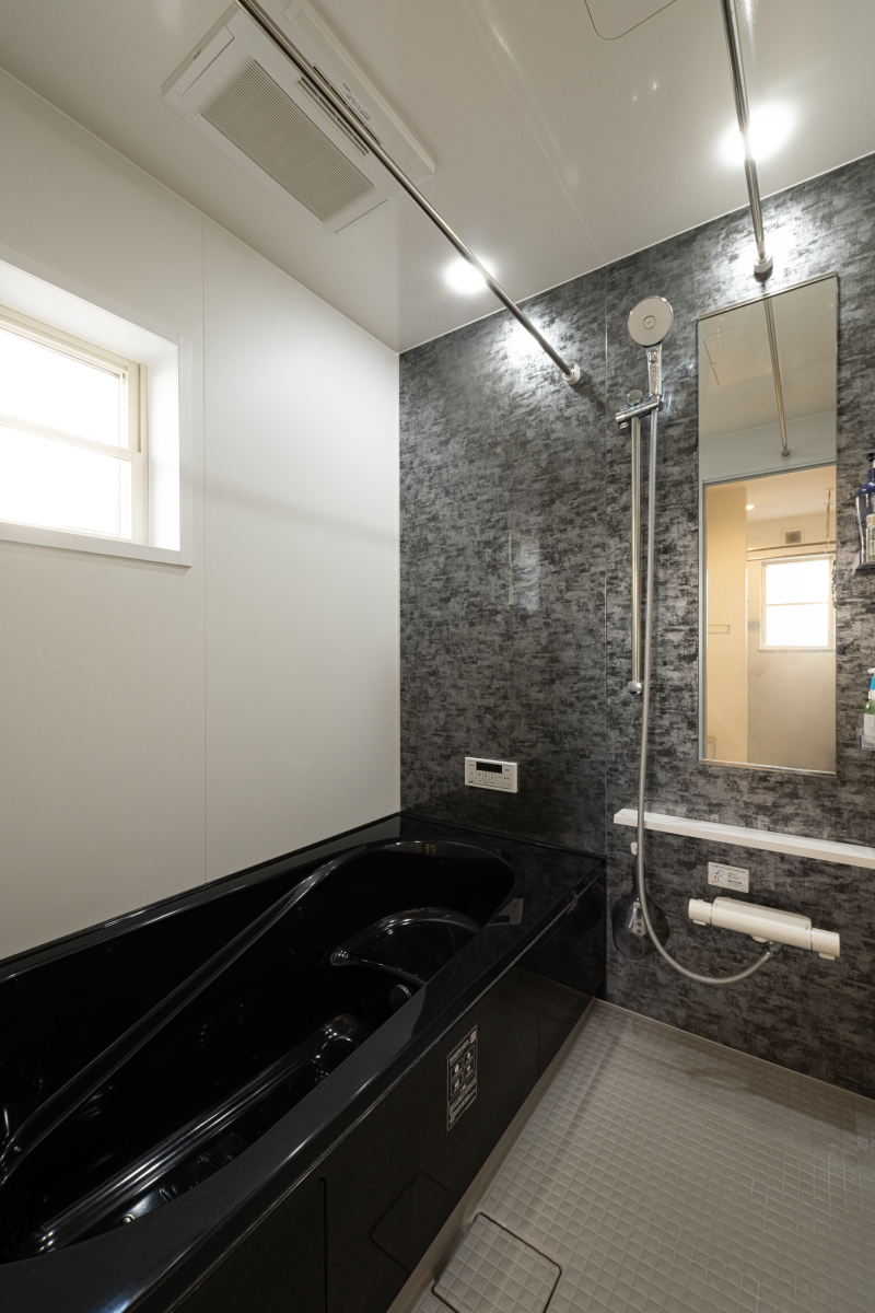 お子様の提案で黒い浴槽を採用。モダンなデザインと機能性が調和した、洗練された浴室空間に仕上がりました。