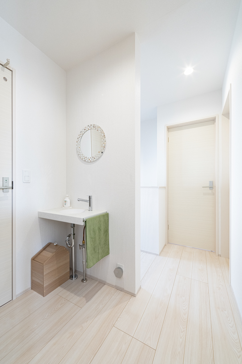 2階の廊下には、トイレの手洗いを兼ねて水が使える洗面台を設けました。ちょっと水を使いたいときでも、1階まで下りずに済むので便利。
