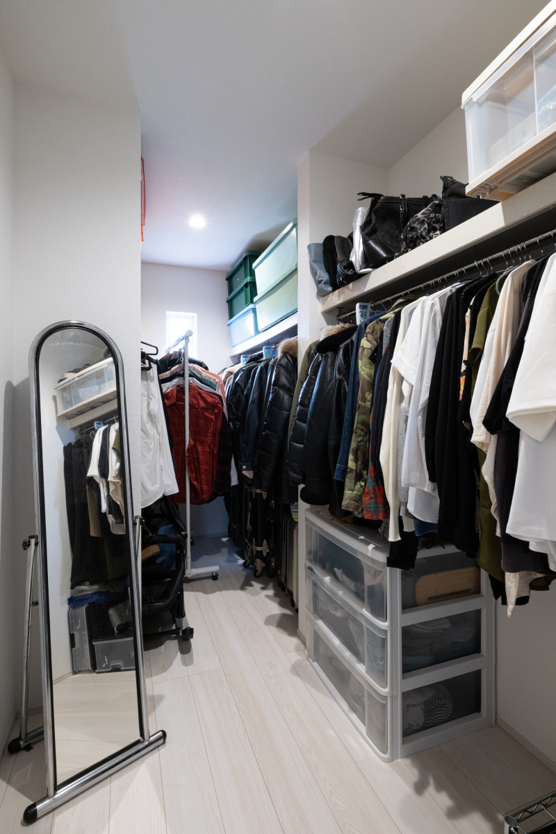 2階には4帖ほどの広さのファミリークロークをつくりました。衣類だけでなく、鞄や小物の収納にも役立ちます。