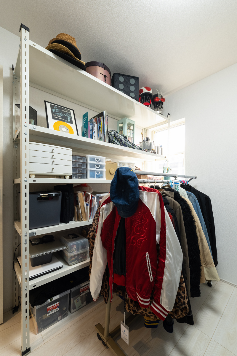 2階には、衣類や趣味の収集品のために納戸を用意。以前は、押し入れの奥にしまっていましたが、いつでも好きなときに手にとることができるようになりました。