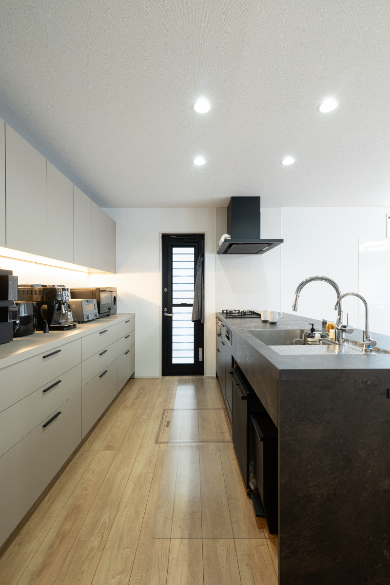 念願のシステムキッチンをついに実現。ショールームでじっくり選んだ色と質感が、都会的で洗練された高級感を演出。