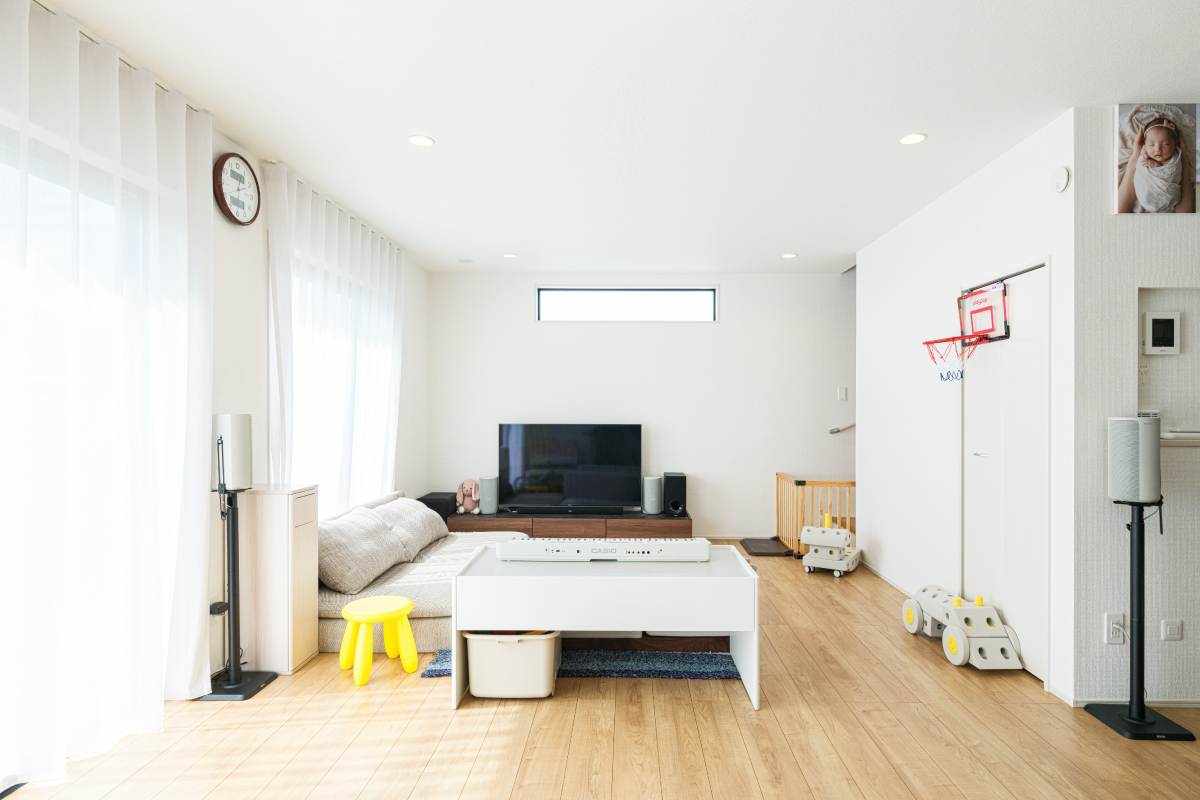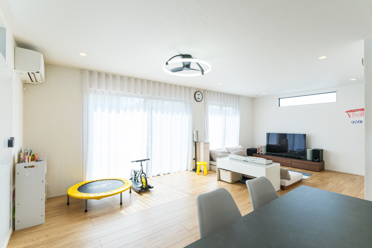 ダイニングテーブルに座ると、リビング全体を見渡せる開放的な間取り設計。ソファを置いても十分なスペースがあり、お子様たちが遊具でのびのびと遊べる広さが魅力です。