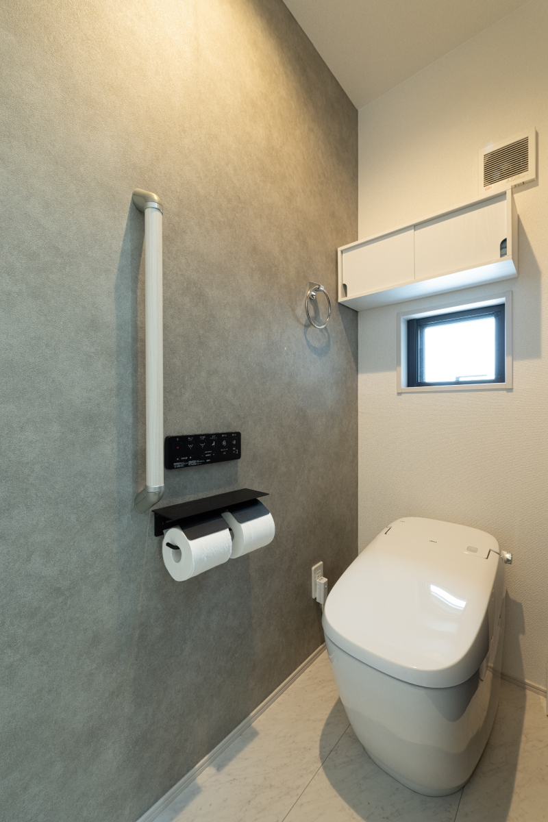 モダンなアクセントクロスと黒いペーパーホルダーでおしゃれな空間に。