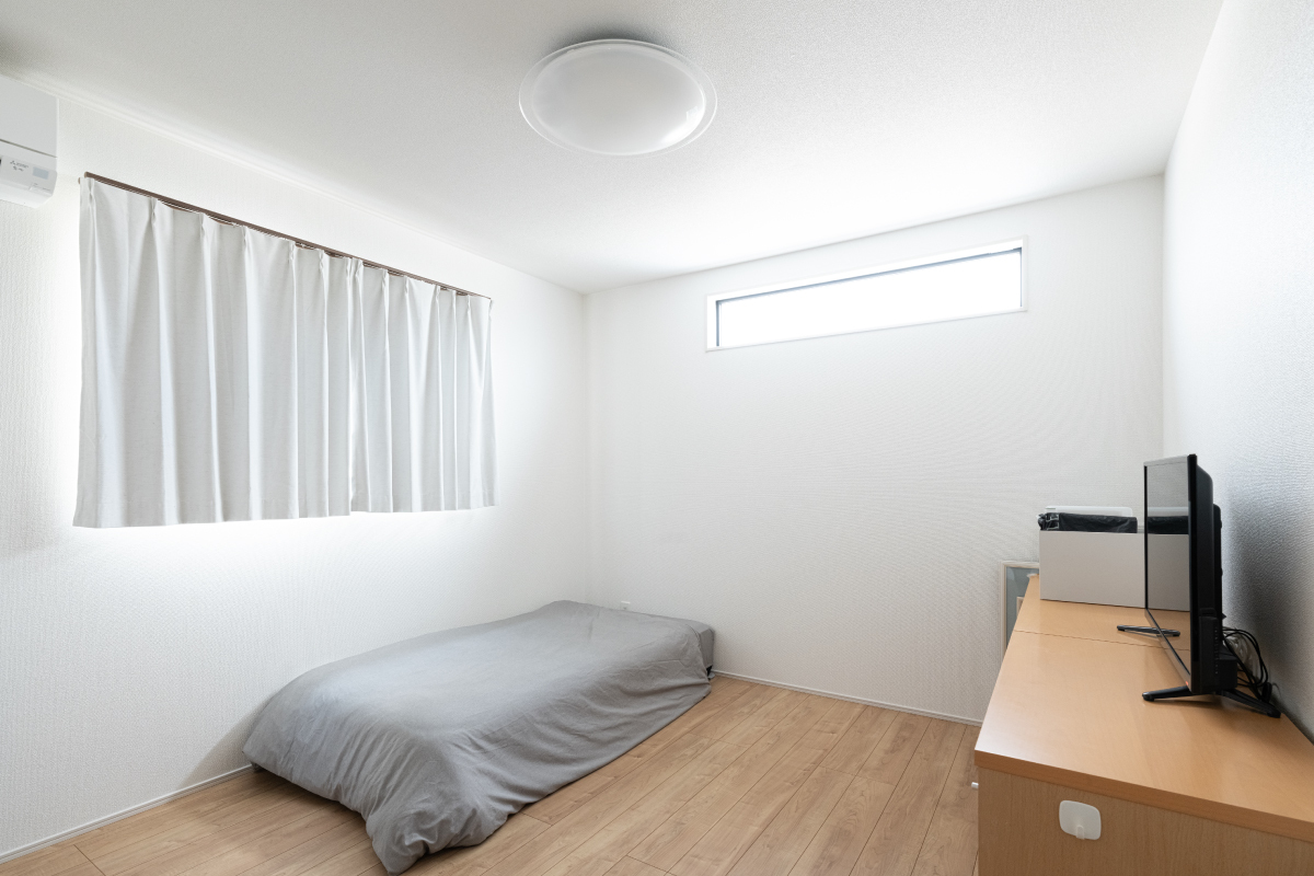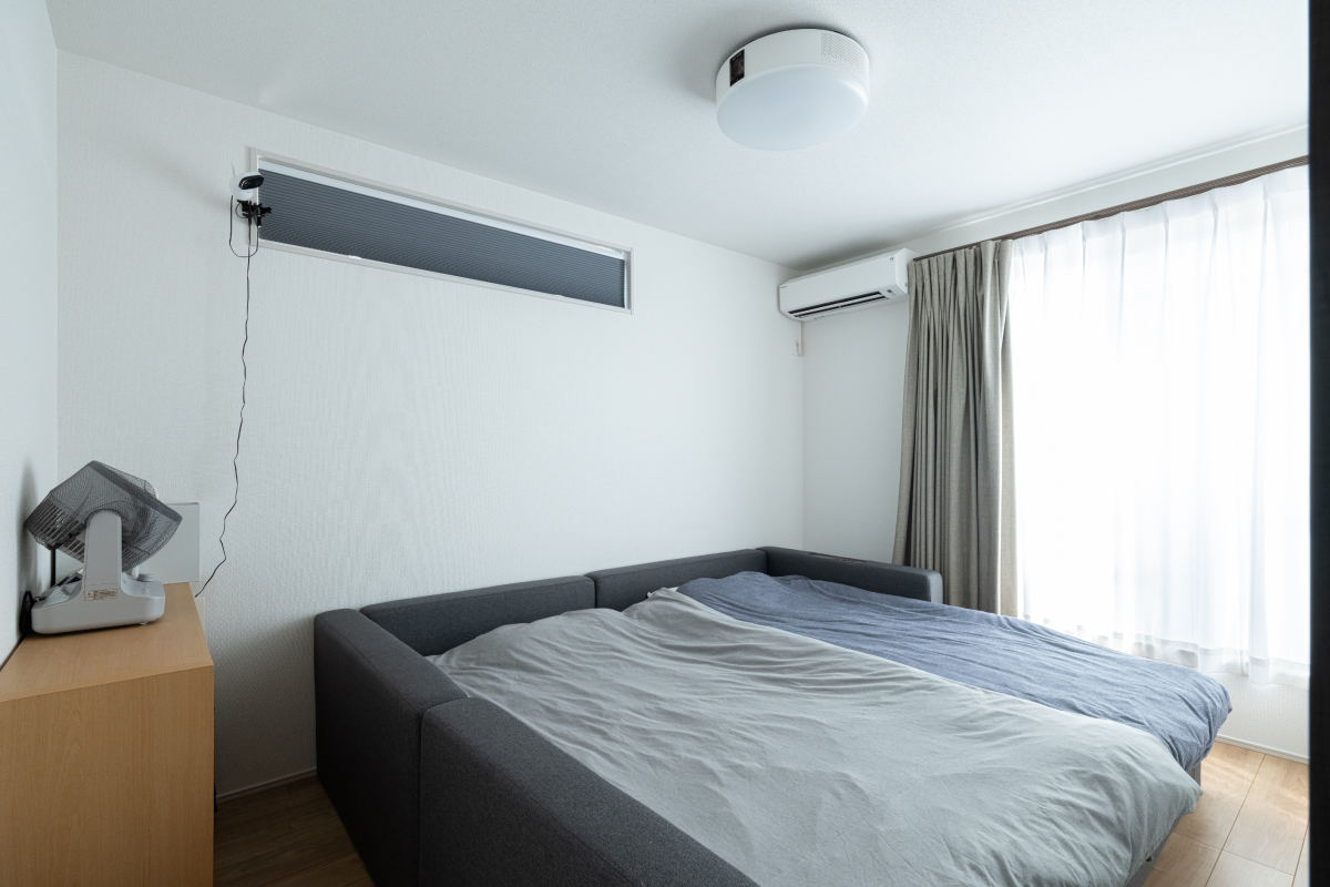隣家側の壁には横長のFIX窓を設置し明るさとプライバシーを確保。南側の掃き出し窓はバルコニーに面し、開放感と自然光を取り入れた寝室空間 。