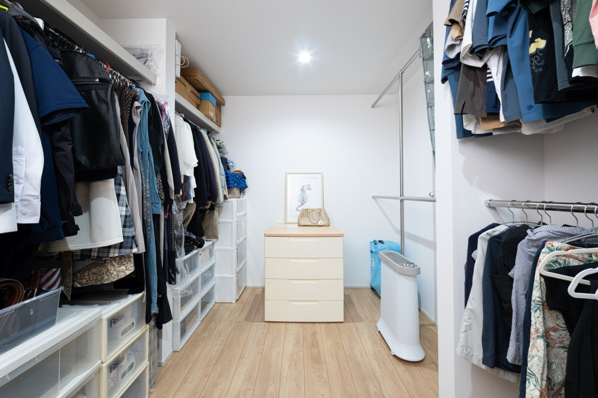 2階には広さ6帖のウォークインクローゼットを設けました。衣替え不要で、家族の衣類をまとめて収納・管理できるため、個室のクローゼットは最小限に。
