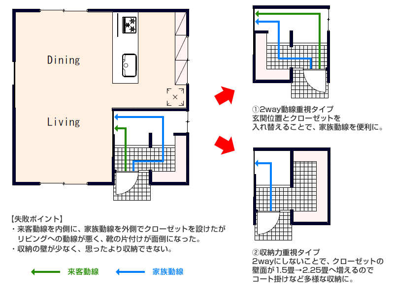 住宅展示場でも採用の多いウォークインシューズクローゼットを利用した家族動線と来客動線の分離による玄関をすっきり見せる方法です。これには2つの失敗があります。