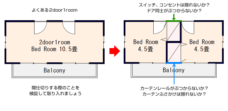 お子様が同性で本棚や収納などの簡易的な間仕切りを想定する方も多いですが、受験勉強で個室の必要性が出る場合もありますので注意しましょう。