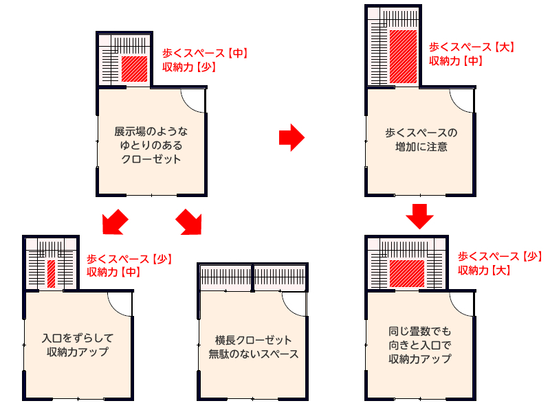 1つはウォークインにする事での収納力の低下、もう1つは動線上、使いにくいケースです。