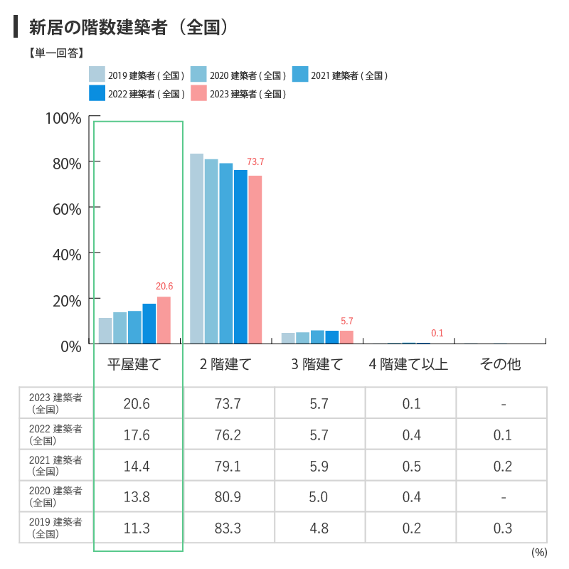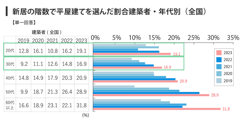 「30代」においては2019年9.2%から2023年には16.9%と若いファミリーの需要が増えており、家事、育児の負担を減らすアイデアとして、平屋人気の底上げとなっています。